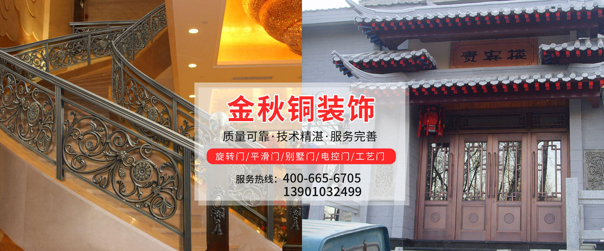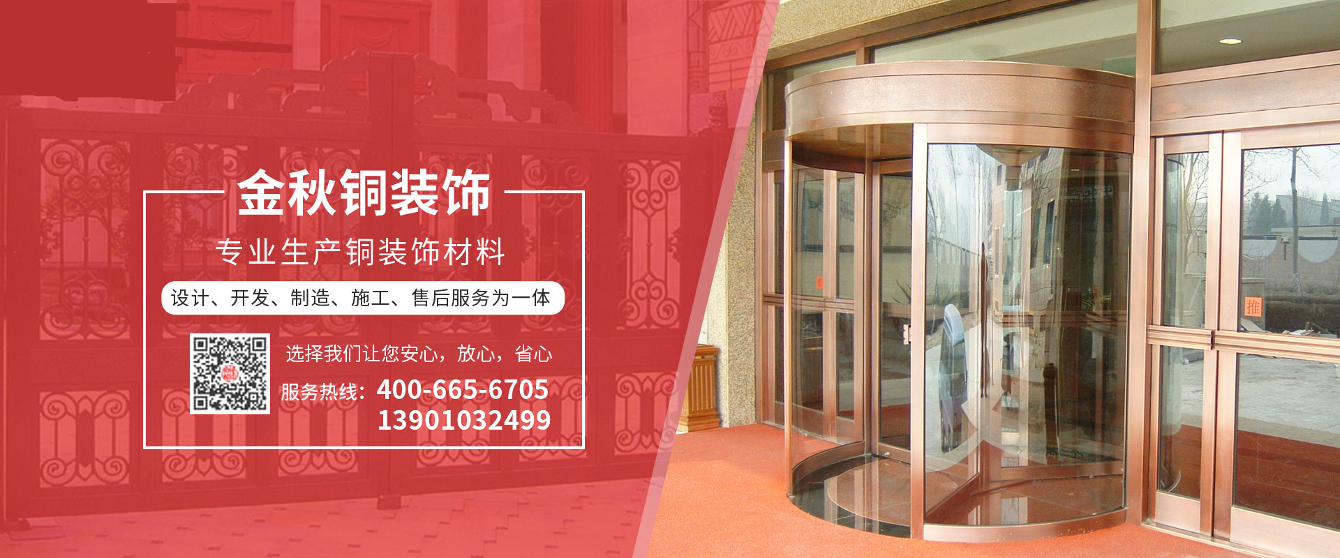 北京金秋銅裝飾材料有限公司是專業(yè)生產(chǎn)銅裝飾材料及設(shè)計(jì)、開發(fā)、制造、施工、售后服務(wù)為一體的大型綜合企業(yè)。可承接建筑銅裝飾工程及五星級酒店、別墅、博物館、樓樘管所等高檔銅裝飾項(xiàng)目;生產(chǎn)各種規(guī)格的旋轉(zhuǎn)門、平滑門、別墅門、電控門、工藝門、旋轉(zhuǎn)護(hù)欄、屋頂銅飾防水瓦、浮雕壁畫......